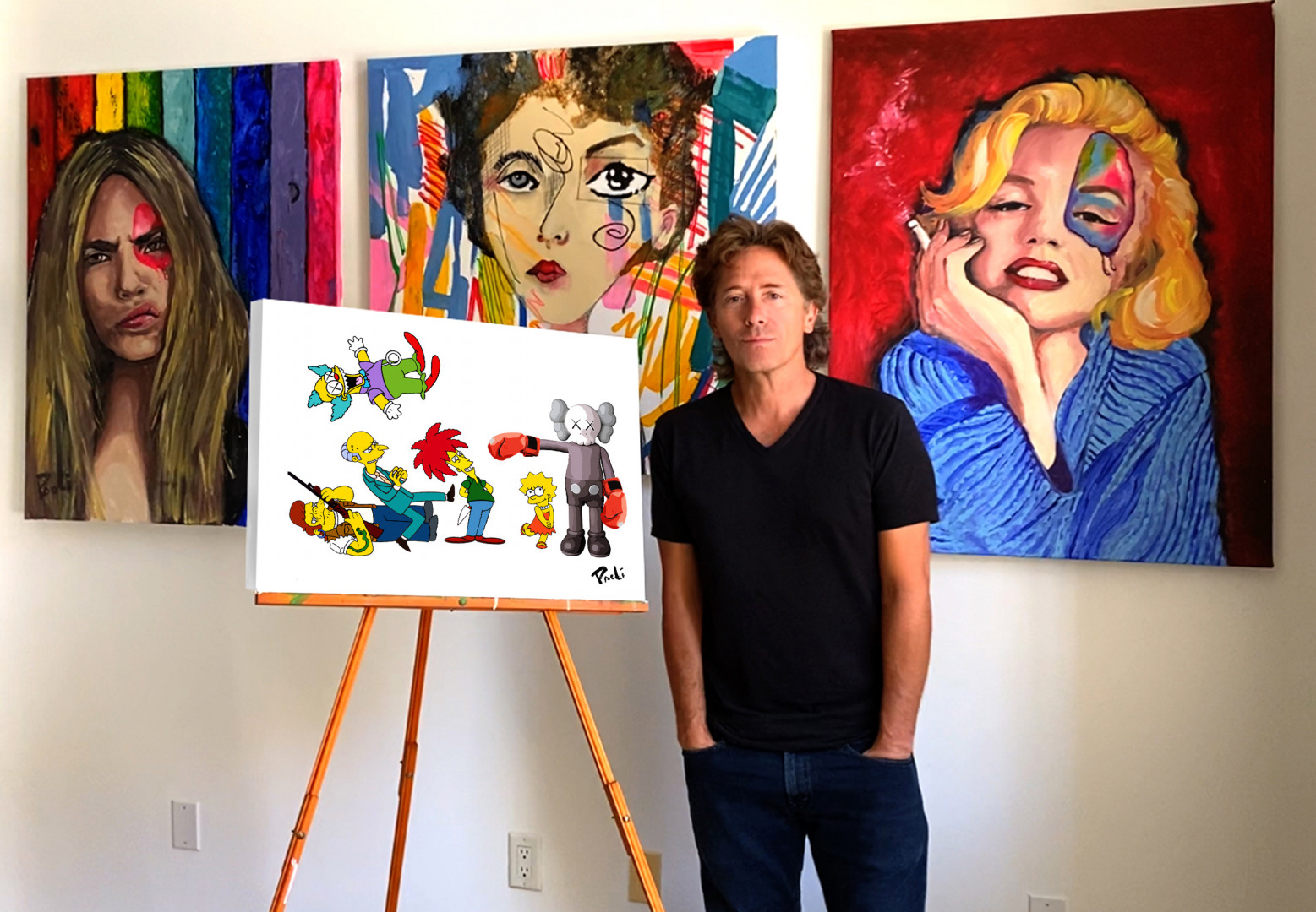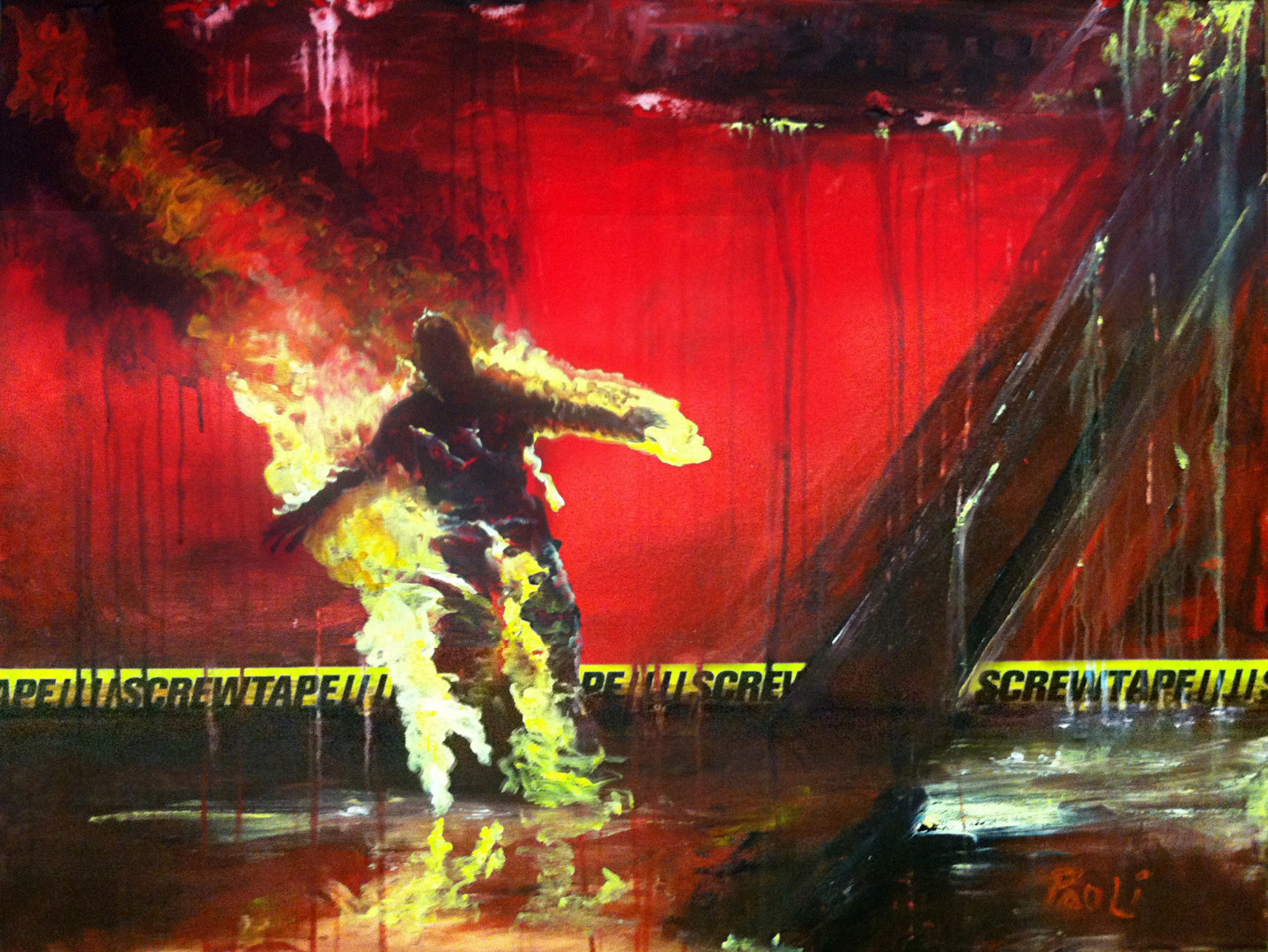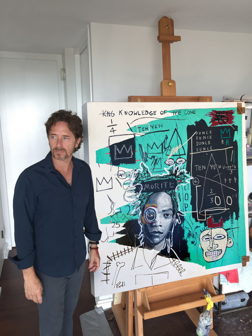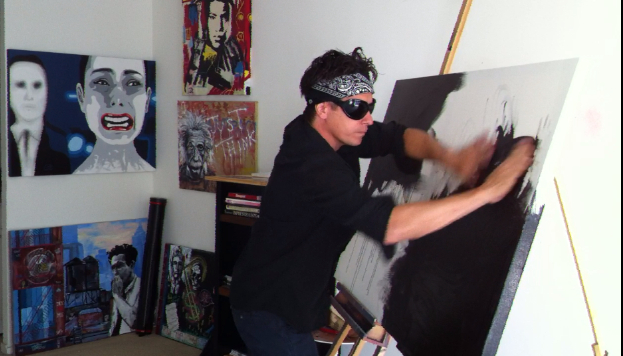 My art came from my Stunt career. The fearlessness is apparent. Ive seen a lot and it shows up on the canvas as cinematic stories not to unlike storyboards used in film production. I have always been an athlete and a stuntman, but I also have great balance. The opposite side of the adrenaline, testosterone spectrum is the quiet, calm practice of creating art. I use my talent for art in every thing I do. Not just to create paintings on canvas and sculptures but in fixing things, adjusting equipment and inventions. And of coarse the magic of giving a heart felt painting as a gift for major breaks in my film career. An exchange of energies if you will. Once my movie career was in full flight, the excitement started to fade. I missed that feeling of being in uncharted territory and also the feeling of being “thrilled”. So I started doing streetart while on location in different cities. That felt real to me. No locked up locations with closed off movie sets on streets with security. I was in the real world at night putting up my art on walls with unlimited outcomes. This passion moved to canvas and continued the story telling. It takes living life to translate the stories to canvas and even onto film.