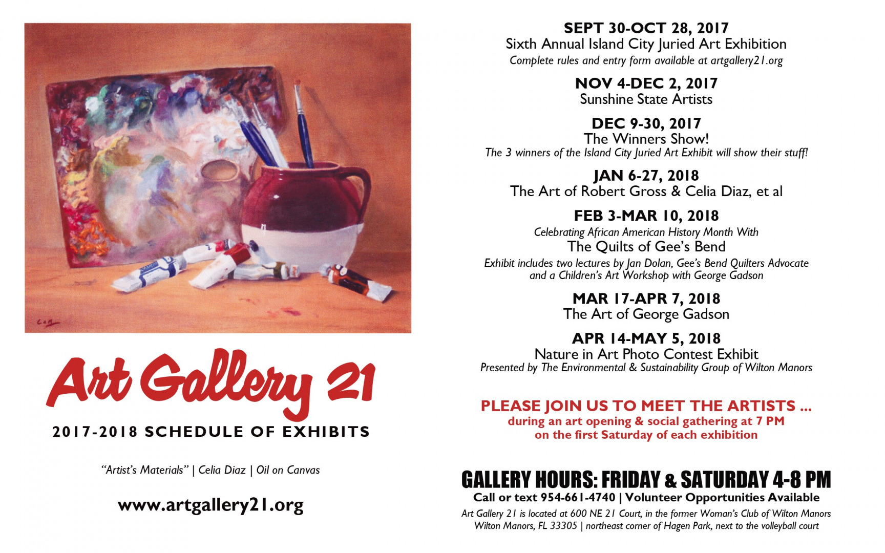 It was an empty, unused building, in need of a little paint and a lot of TLC, that we discovered early one Saturday morning in November 2011 that lead us to see what it could be … Art Gallery 21 at the Island City Cultural Center. A small group of local artists had been hanging art in City Hall for a couple of years when we made the discovery of the Woman’s Club of Wilton Manors, and with permission from the Wilton Manors City Commission, we began presenting art exhibits in July 2012.