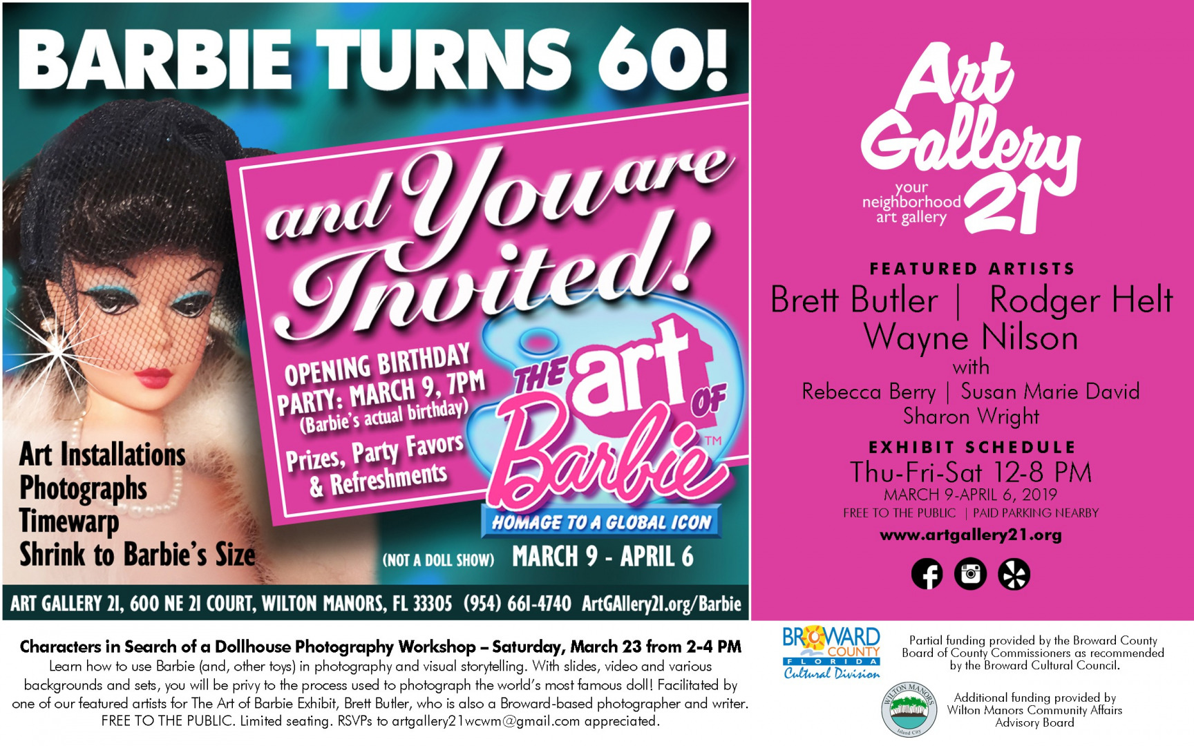 Since 2012, Art Gallery 21 has hosted a Smithsonian Traveling Exhibit: The Way We Worked, thanks to support from the Florida Humanities Council. We have been a recipient of funding from Broward County Cultural Division through their Program Support, which has allowed us to exhibit the Quilts of Gee’s Bend, (2018) The Art of Barbie (2019), Mermaids & Manatees (our pandemic project), and so much more over the years. We make a real effort to keep it fresh, always on the lookout for new faces, new talent and new ideas. The majority of our exhibition ideas come from the artists and it’s that cosmic Velcro of energy and fun that make it a joy to be at Art Gallery 21.
