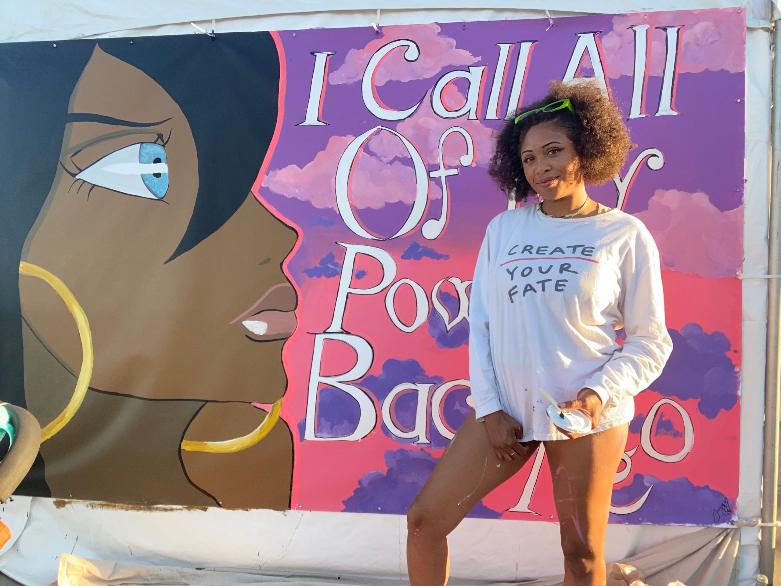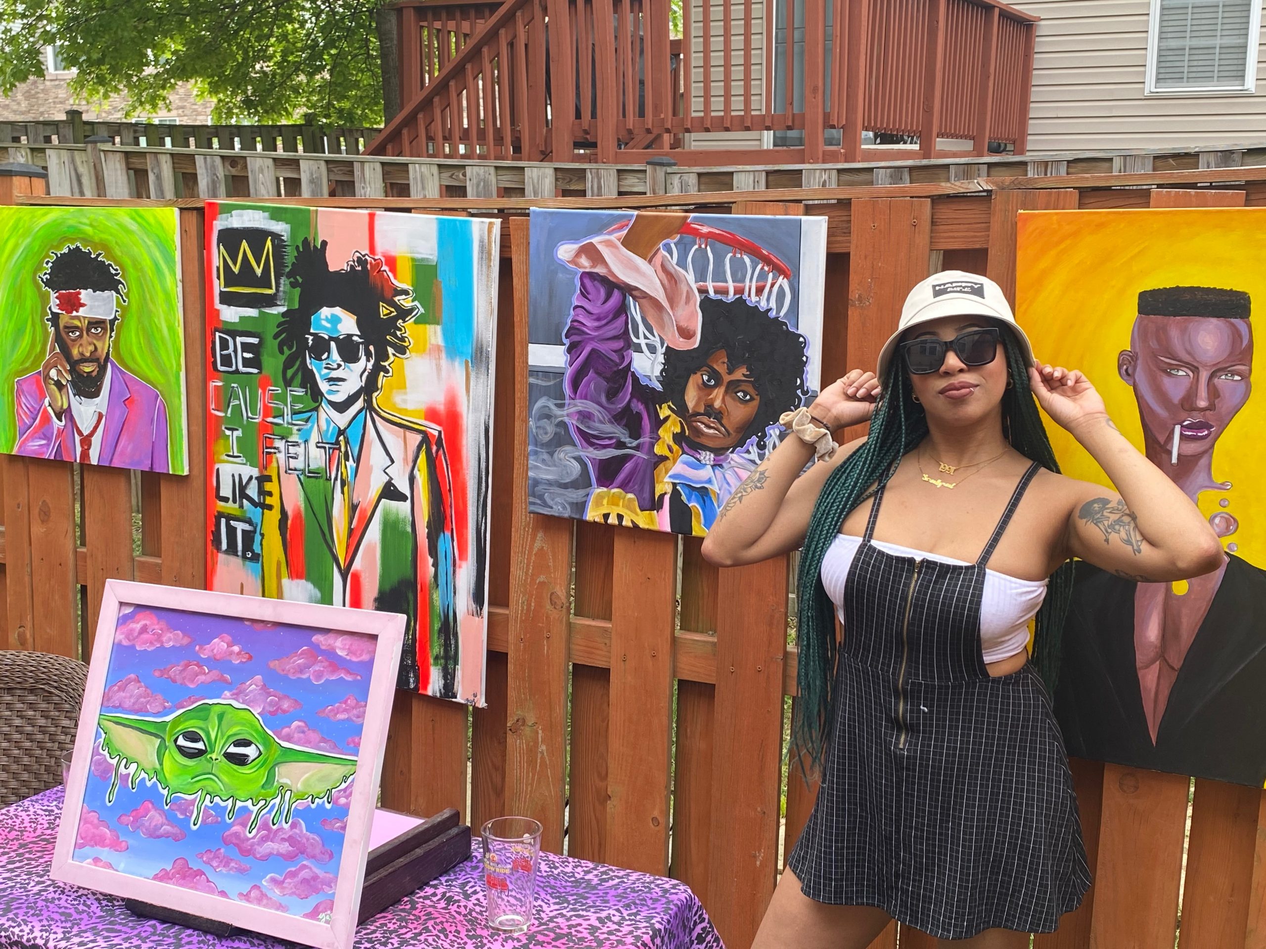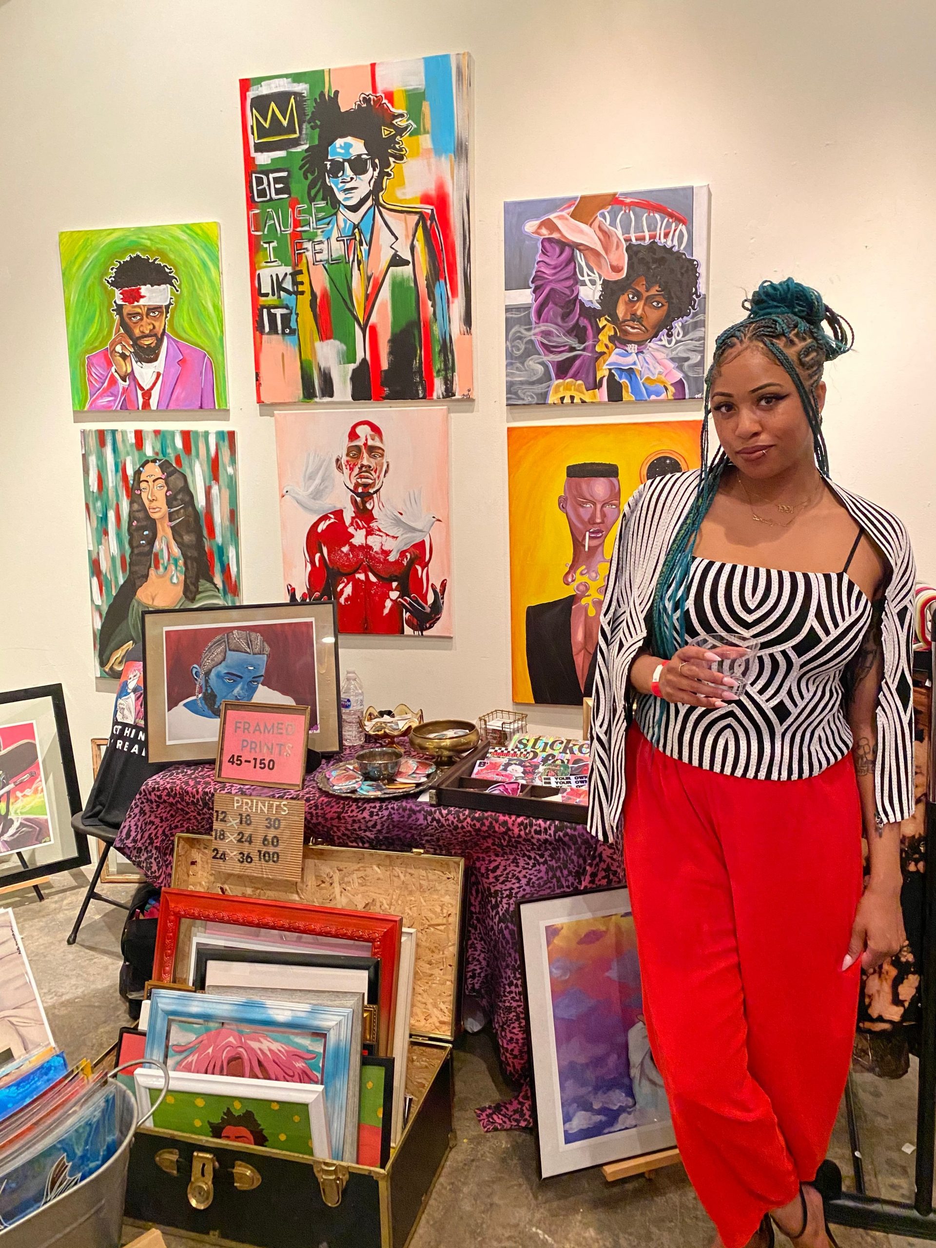 As an artist my goal is to be a platform for art that includes black and brown people. I always say black culture IS popular culture. I love to shine light on certain artists, movie scenes and figures that stand for things that mean something to me. Feminism, gender role ideologies, humor, history, duality, politics whatever is on my heart. I think my art definitely stands out because of the pallet I choose. I love to use bright neon colors, and I really like to paint clouds as a background. I was definitely inspired by Lisa frank as a kid.