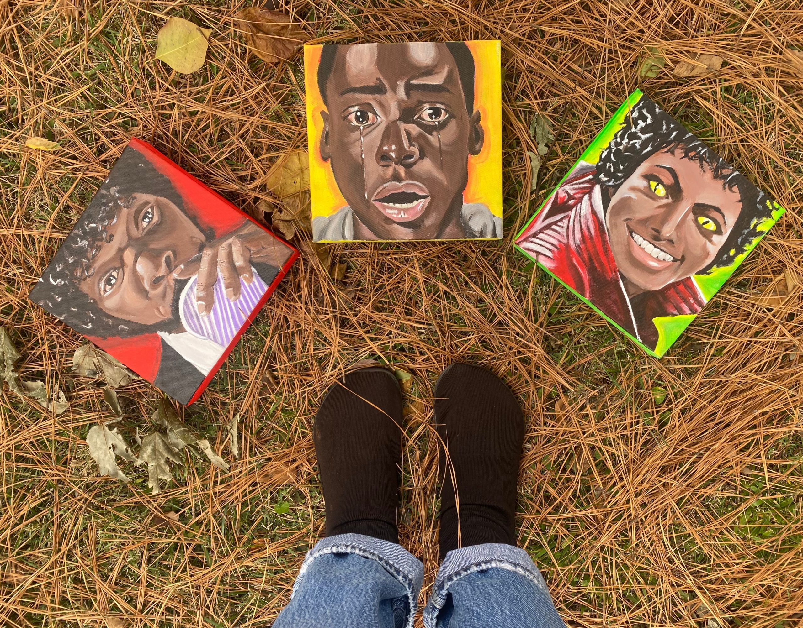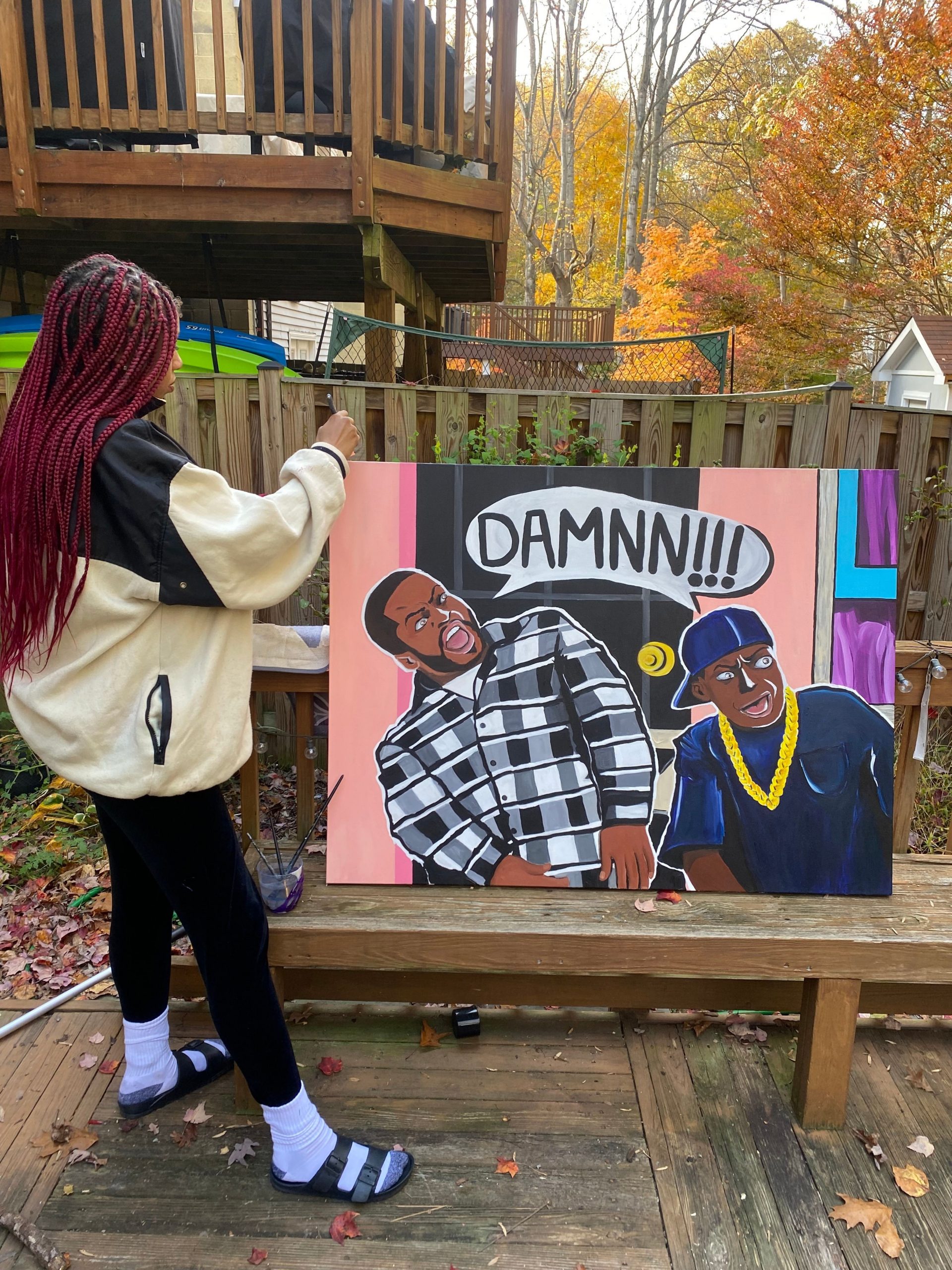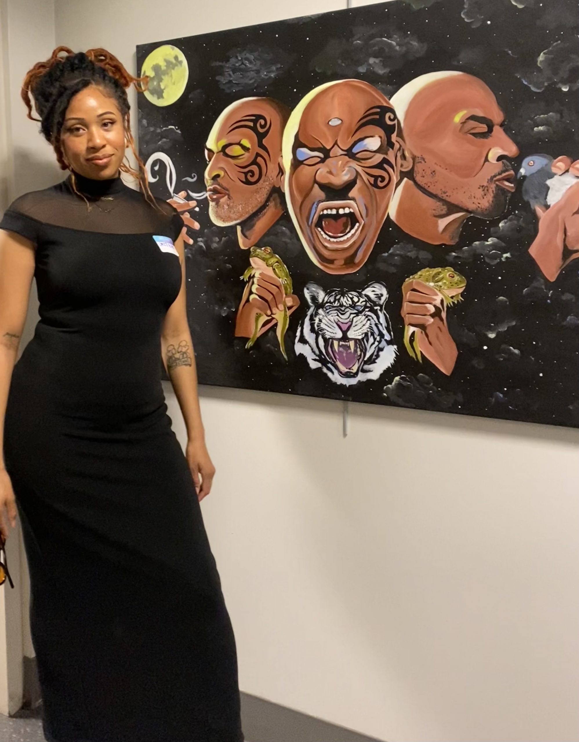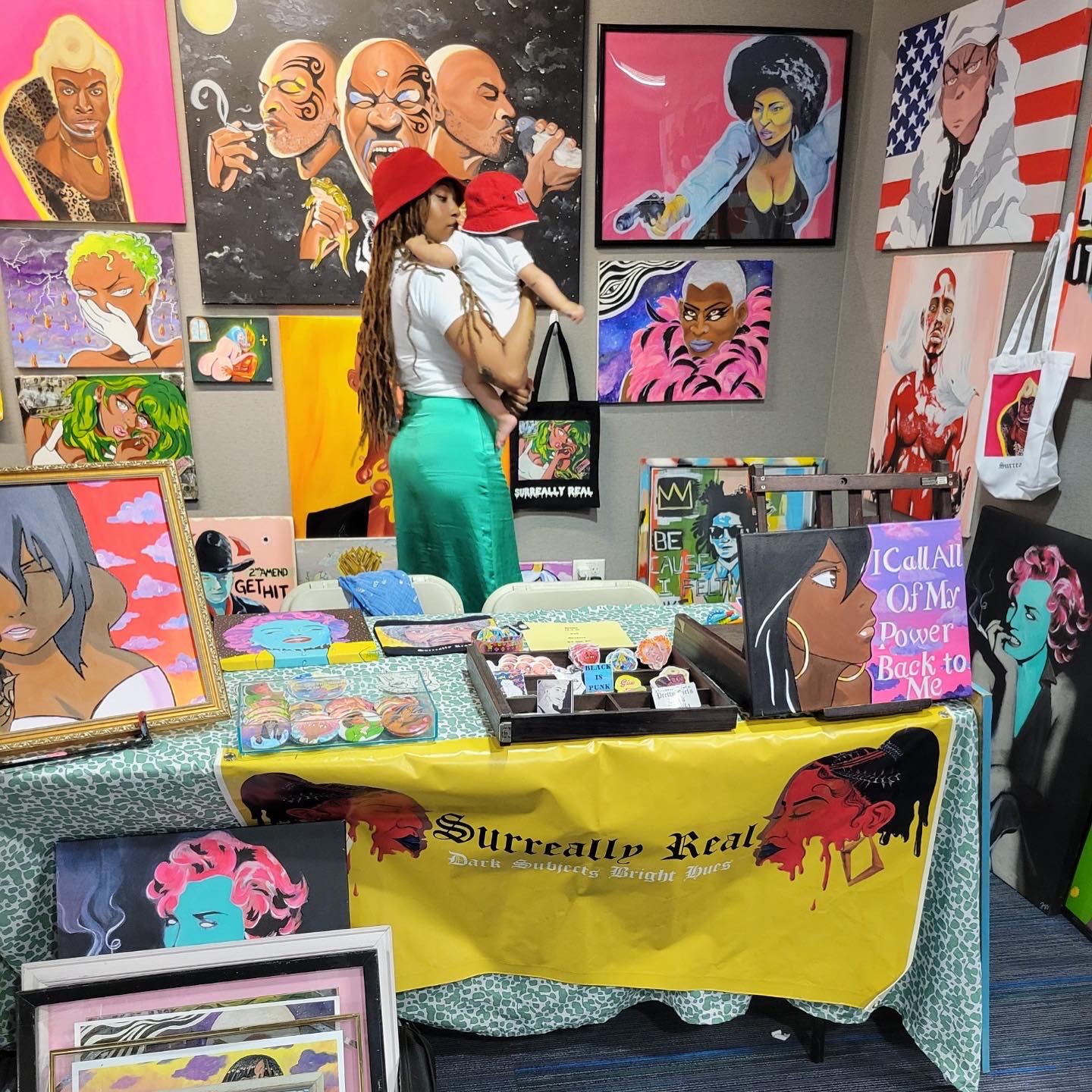 As an artist my goal is to be a platform for art that includes black and brown people. I always say black culture IS popular culture. I love to shine light on certain artists, movie scenes and figures that stand for things that mean something to me. Feminism, gender role ideologies, humor, history, duality, politics whatever is on my heart. I think my art definitely stands out because of the pallet I choose. I love to use bright neon colors, and I really like to paint clouds as a background. I was definitely inspired by Lisa frank as a kid.